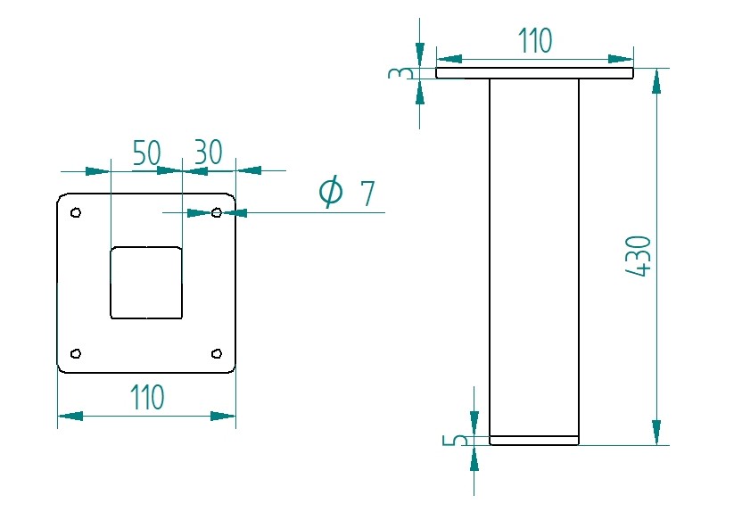 Noga prosta o kwadratowym przekroju w stylu loftowym, industrialnym do stołów, stolików o wymiarach 43 cm wysokości. Kwadratowa szeroka podstawa o bokach 110 mm, grubości 3 mm pozwala na solidne przykręcenie jej blisko krawędzi blatu.